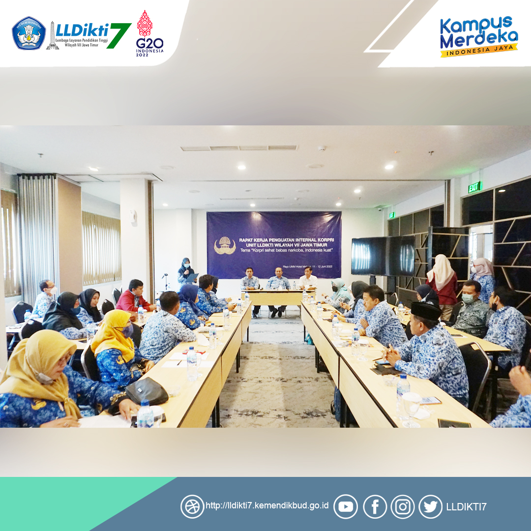 Malang – Dalam rangka meningkatkan soliditas internal KORPRI LLDIKTI Wilayah VII menggelar Rapat Koordinasi Pengurus dan Korwil KORPRI di Hotel Rayz UMM Malang, Sabtu (11/6/2022). Acara yang mengusung tema “KORPRI Sehat Bebas Narkoba, Indonesia Kuat” ini dihadiri oleh Pembina, Ketua, jajaran pengurus, serta perwakilan Korwil KORPRI Unit Kerja LLDIKTI Wilayah VII Jawa Timur.